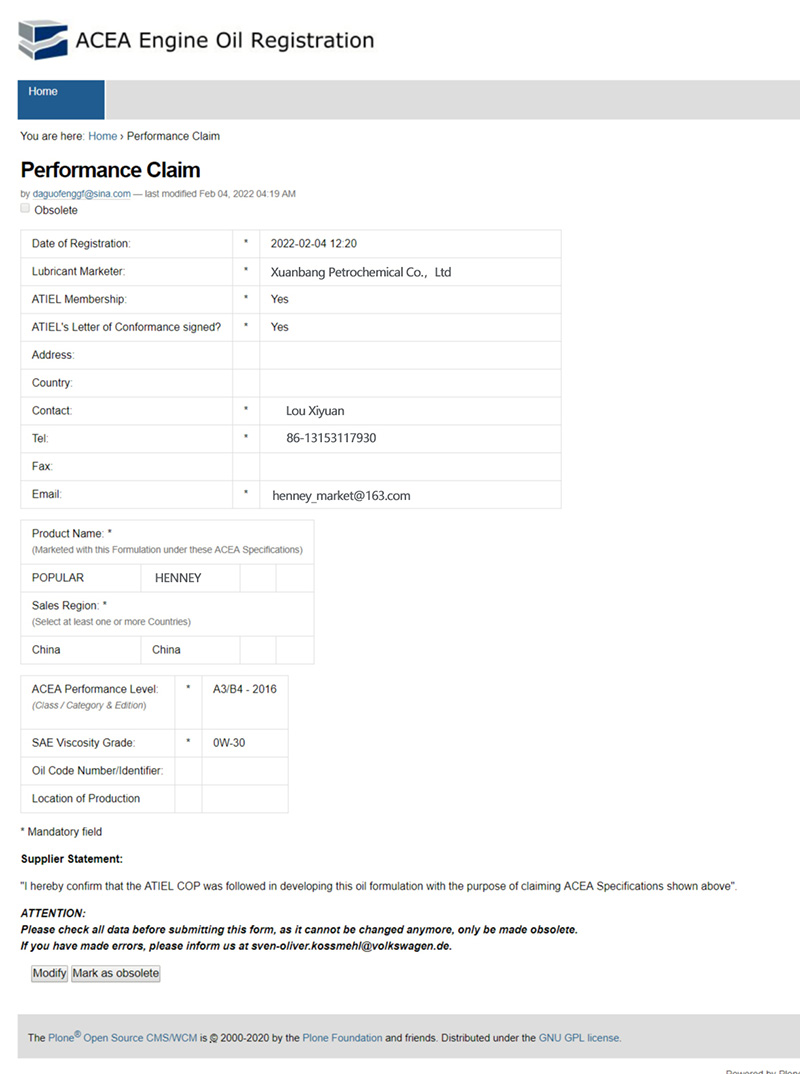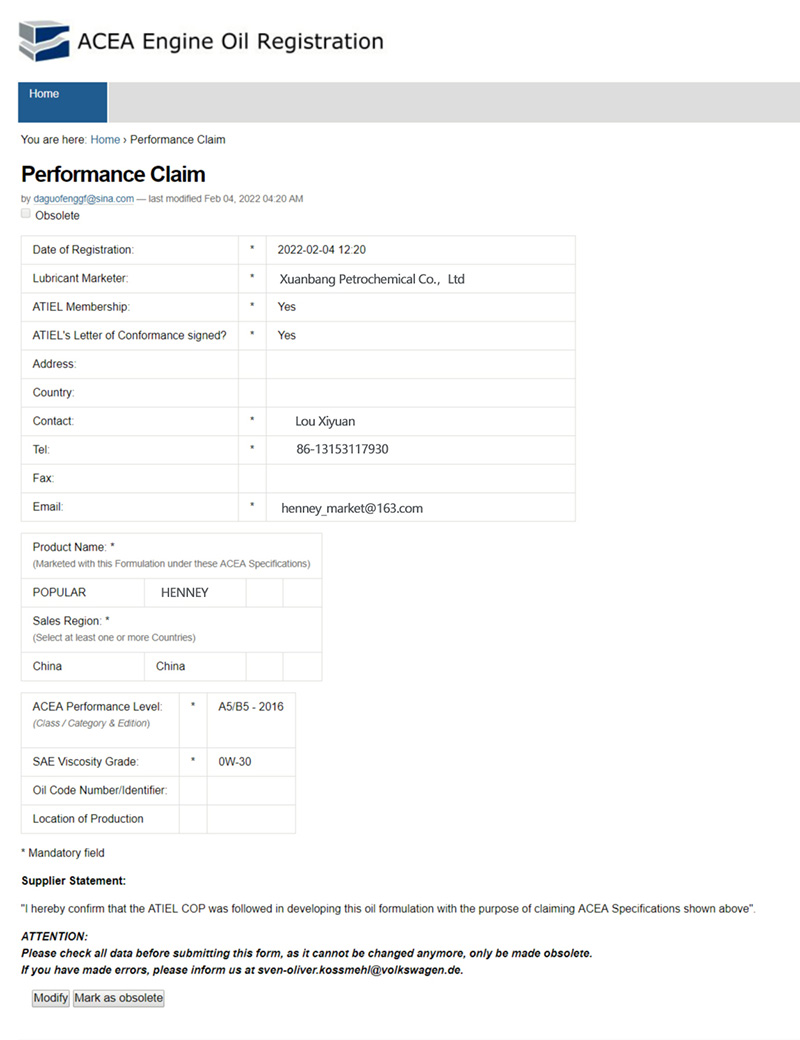 ACEA A3/B4 认证证书